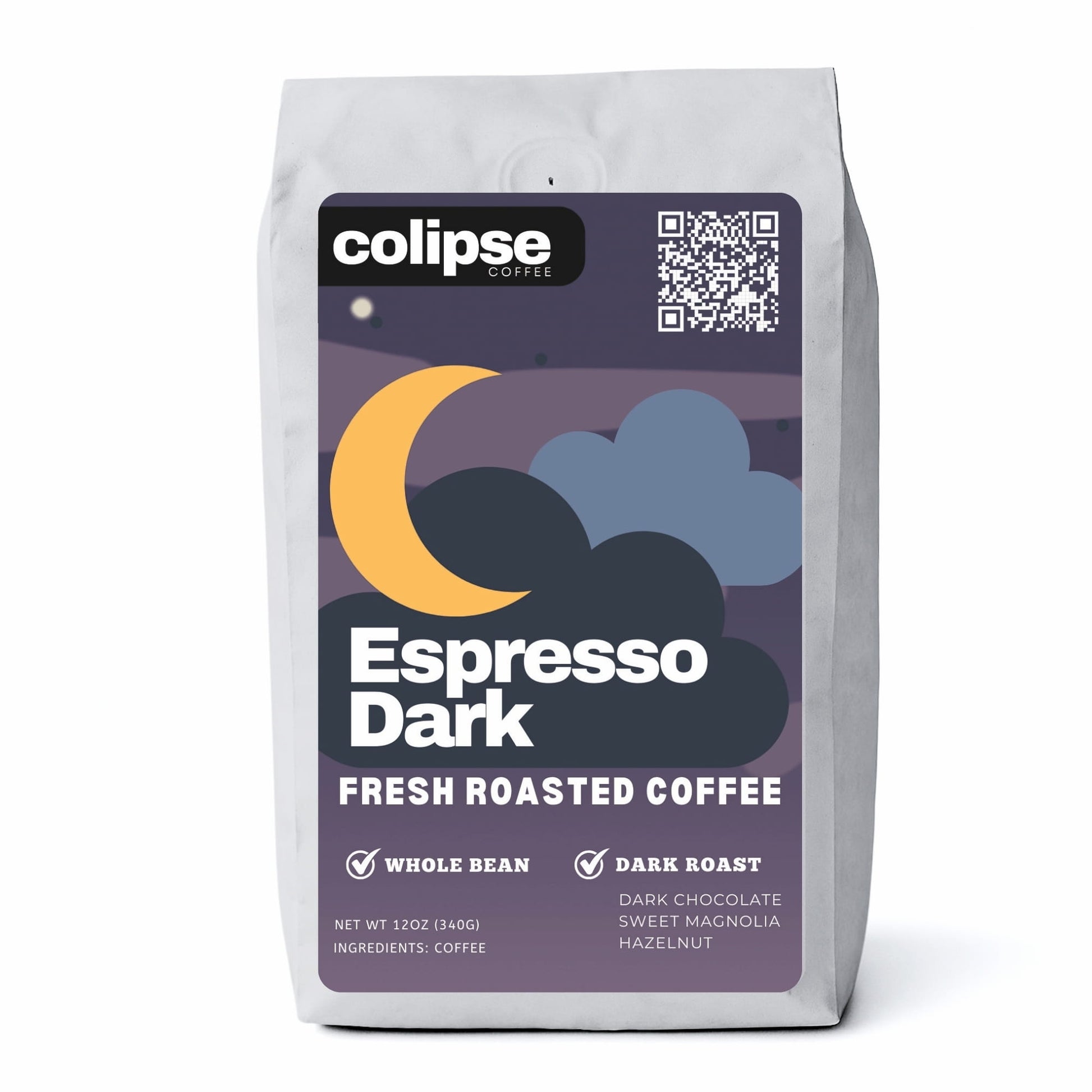 Buy Colipse Espresso Dark as whole beans or pre-ground in coarse, medium, or fine grinds. Choose from 12 oz, 16 oz, 2 lb, or 5 lb bags for personal use, gifts, events, or frequent brewing. Get discounts on larger sizes.