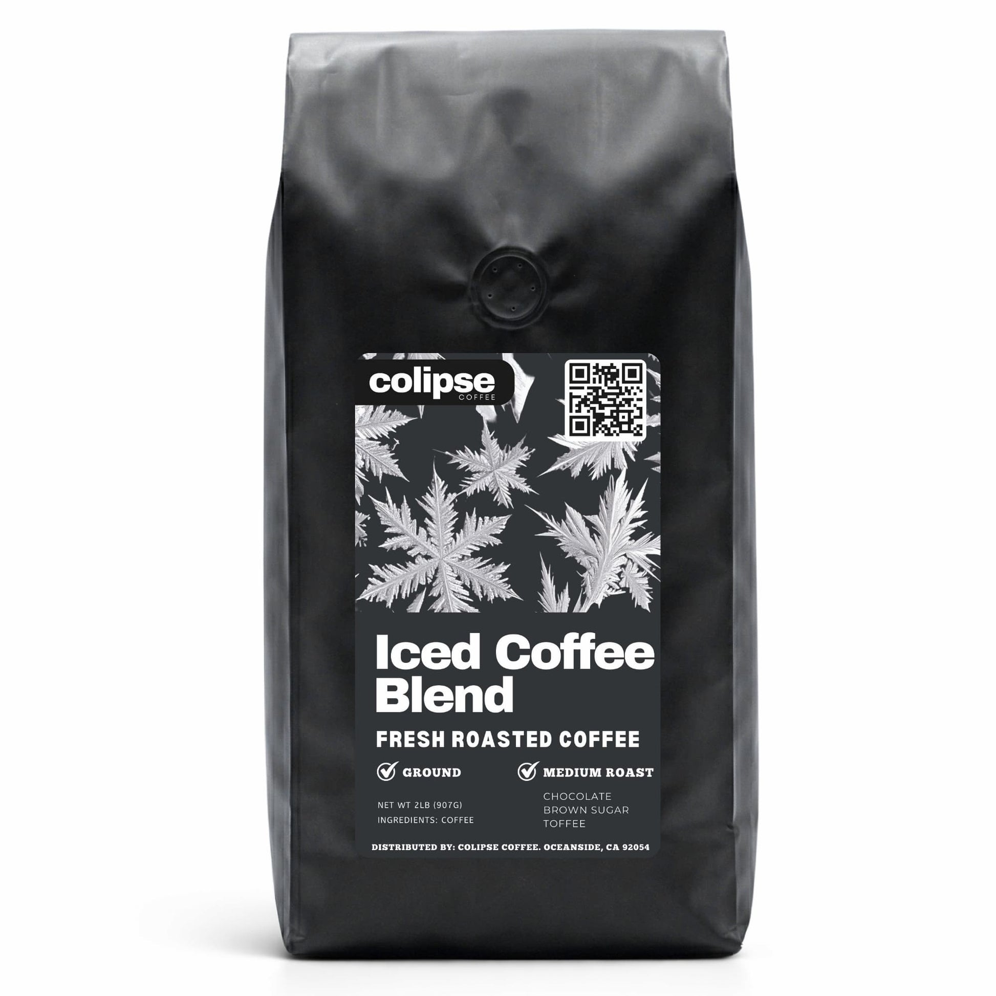 Colipse Iced Coffee Blend is a medium roast Arabica coffee from Sumatra and Colombia, available as whole beans or grounds, that brews a naturally sweet iced coffee with chocolate, brown sugar, and toffee notes and supports various brewing methods. This specialty-grade coffee is perfect for making iced americanos, lattes, mochas, or iced espresso at home.